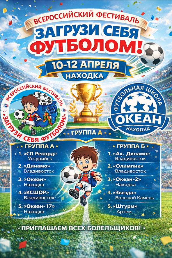 Следующий турнир в рамках Всероссийского фестиваля «Загрузи себя футболом» в группах «А» и «Б» пройдёт 10-12 апреля на стадионе футбольной школы «Океан».