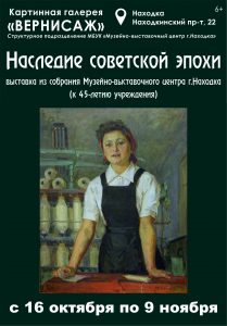 На выставке «Наследие советской эпохи» представлены живописные и графические произведения из фондов музея. Зрители увидят жанровые картины, портреты, пейзажи и натюрморты, картины известных мастеров советской эпохи второй половины XX века, которые по праву считаются жемчужиной коллекции Музейно-выставочного центра г. Находка. Также в экспозицию вошли работы современных художников.