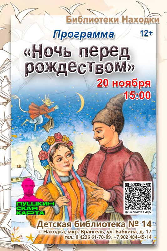 Мероприятие по мотивам одноименного произведения Николая Васильевича Гоголя состоится 20 ноября в 15:00 в Детской библиотеке № 14, мкр. Врангель, ул. Бабкина, д. 17. Возрастная категория 12+